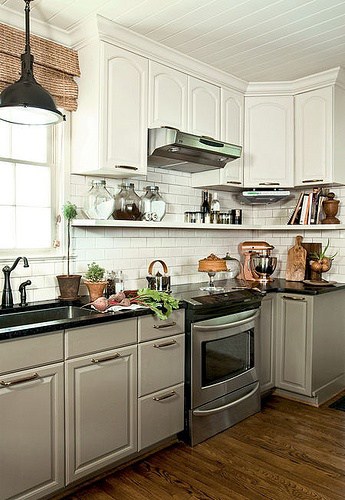 Applying two different colors of paint on cabinetry (such as light on upper, dark on lower), will give the kitchen a custom look, even if the cabinets are out of a box