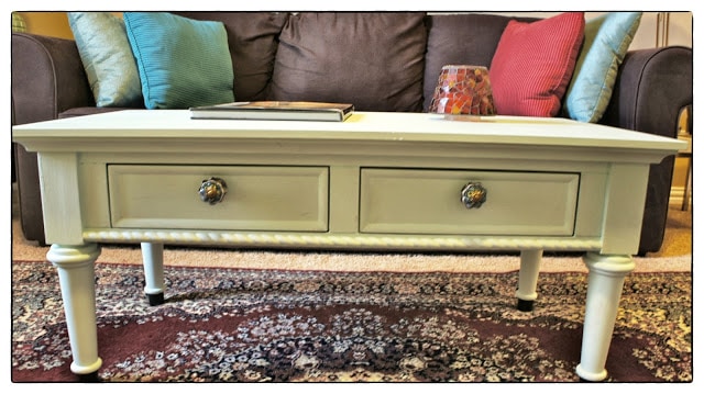 Here’s a little coffee table makeover that I worked on while my sister was teaching. When I painted it, I kept the feet the original black paint. The knobs my sister picked out at World Market.