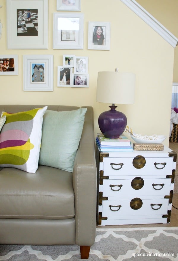 For the final look, I brought back my purple and green pillows and purple lamps but kept the bigger black and white pillow. I have a feeling there will be a change to the lamps soon.